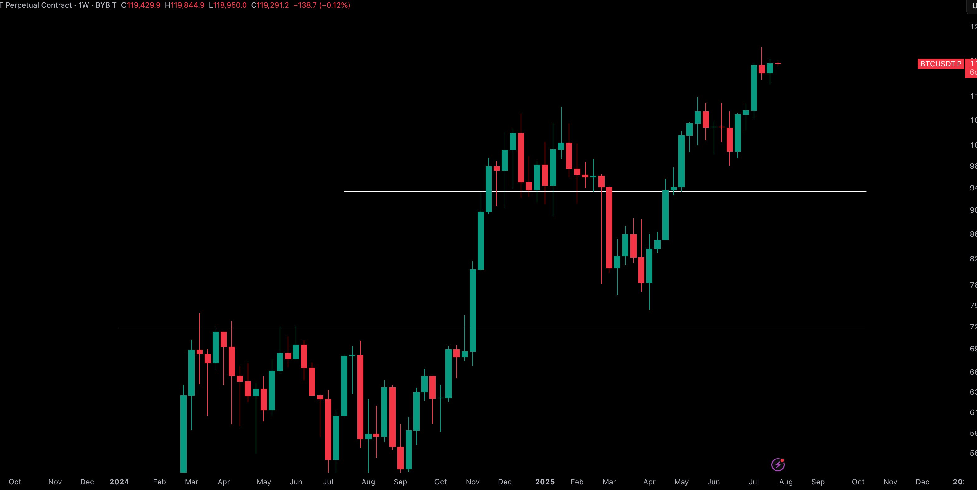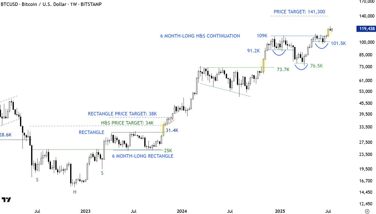 “Breakout in the first week of July was with a long white candle,” he told X followers alongside a chart with a $141,300 target.