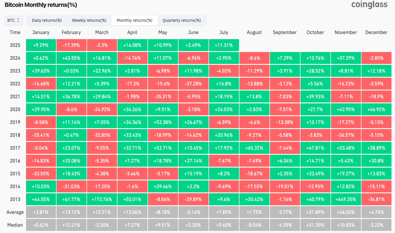 CoinGlass data shows that while BTC/USD is up 11.3% in July 2025, it is only marginally above the average over the past 12 years.