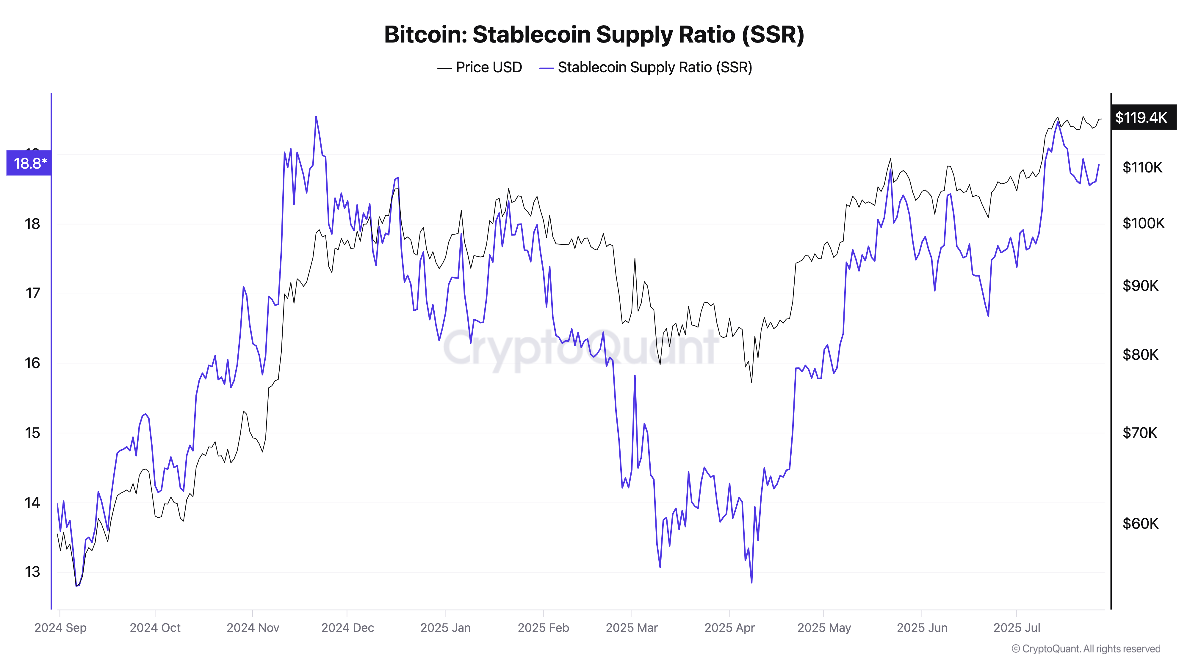 The stablecoin supply ratio (SSR) has been growing in step with BTC/USD — something which could signal a lack of stablecoin liquidity, or “dry powder,” available for investment.
