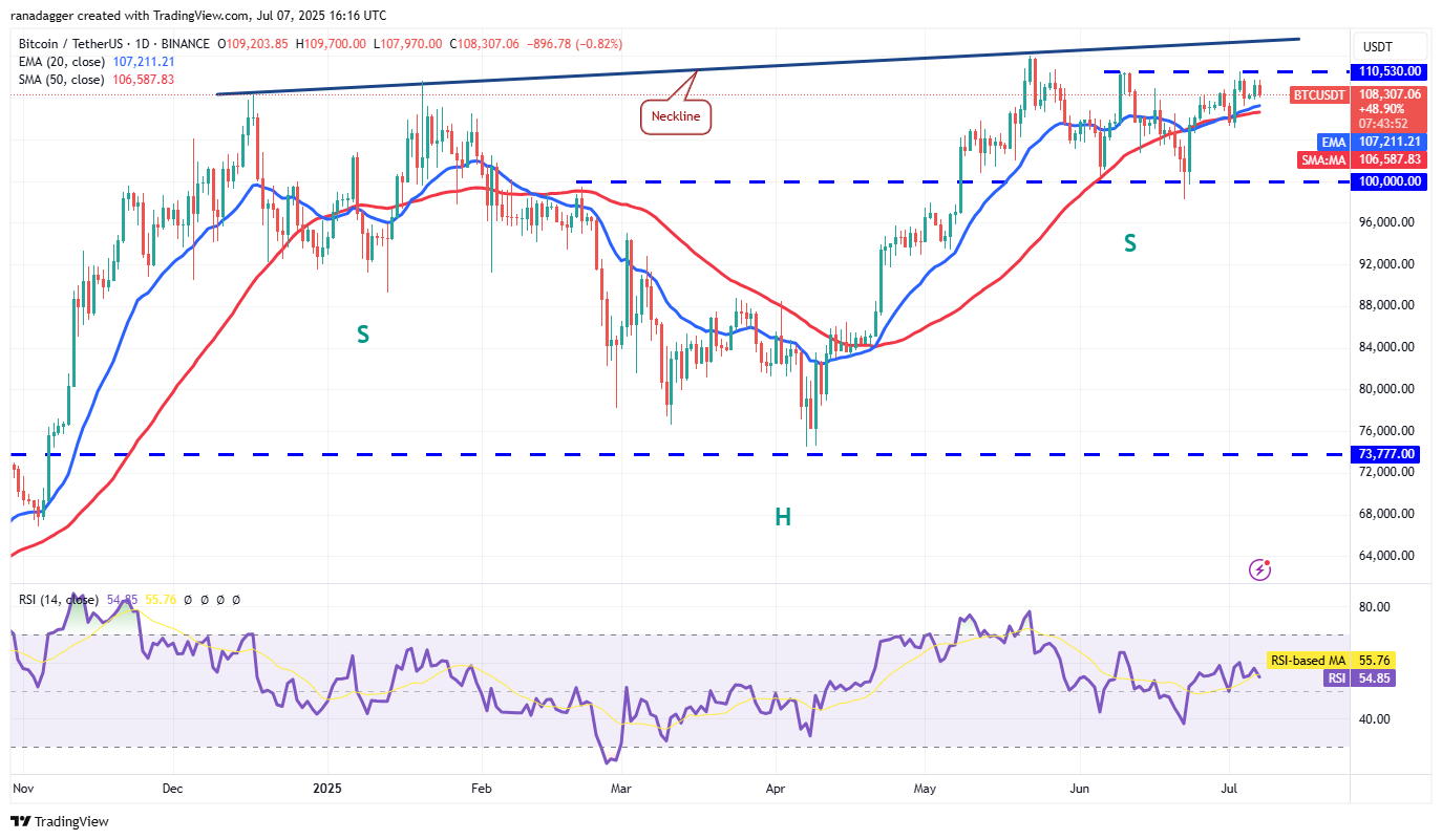 Bitcoin has been oscillating between the 20-day EMA ($107,211) and the overhead resistance of $110,530.