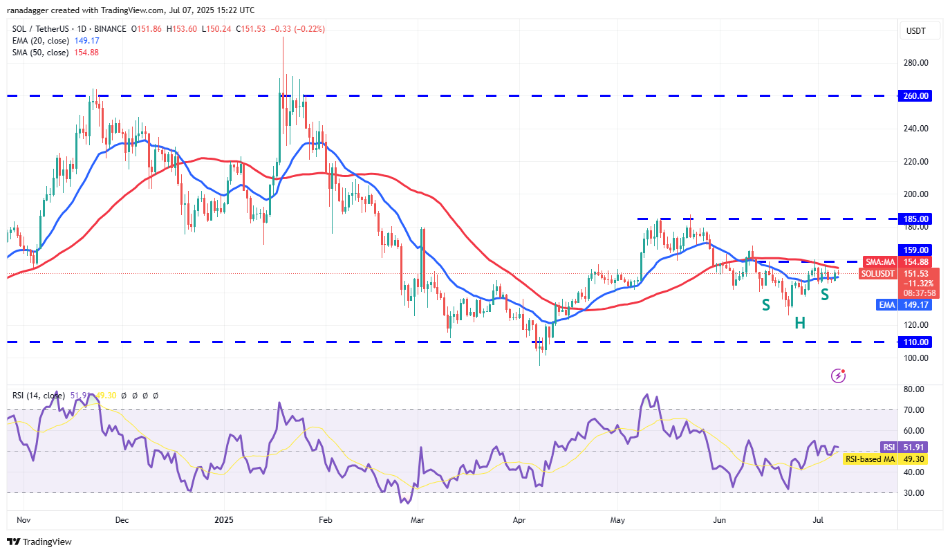 The bulls managed to push Solana (SOL) above the 20-day EMA ($149) on Sunday but are struggling to break above the 50-day SMA ($154).
