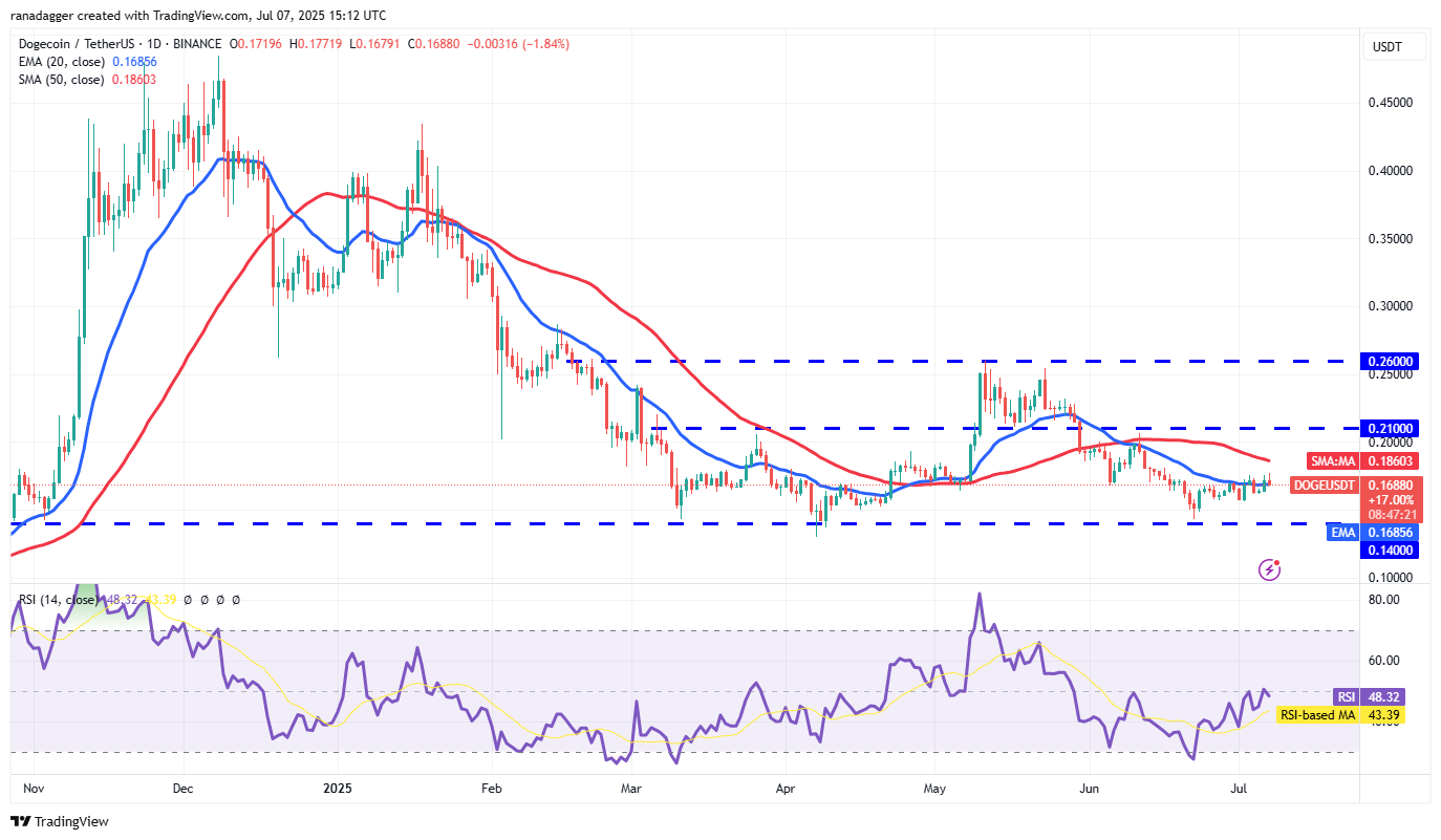 If buyers maintain the price above the 20-day EMA, the DOGE/USDT pair could rise to the 50-day SMA ($0.18) and later to $0.21. Sellers are expected to defend the $0.21 level, but if the buyers prevail, the pair could soar to $0.26.