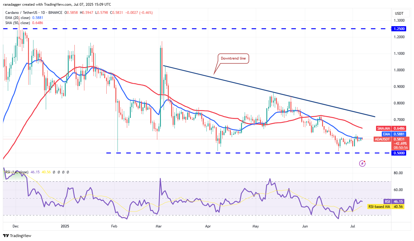 The flattening 20-day EMA and the RSI just below the midpoint suggest the selling pressure is reducing. If buyers drive the price above the 20-day EMA, the ADA/USDT pair could rally to the 50-day SMA ($0.64) and then to the downtrend line. The bulls will have to push and sustain the price above the downtrend line to signal a potential trend change.