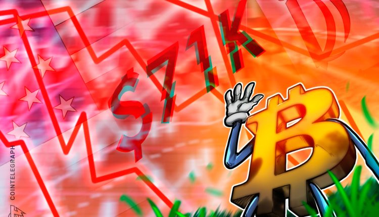 Bitcoin (BTC) fell 3% to trade below $71,000 into Sunday’s weekly close after negotiations to end the US-Iran war broke down.