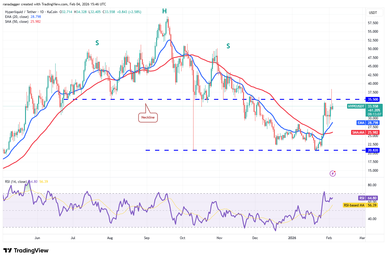 Instead, if the Hyperliquid price turns down sharply from the current level and breaks below the 20-day EMA ($28.79), it suggests that the pair may continue to oscillate between $35.50 and $20.82 for a while longer.