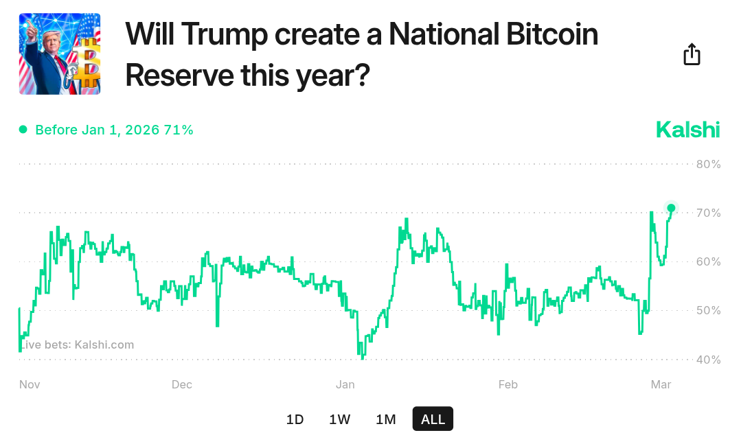 The latest data from prediction service Kalshi gives a 71% chance of a Bitcoin reserve this year — the highest-ever odds.