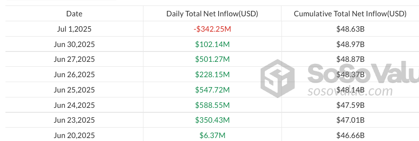 According to data from SoSoValue, US spot Bitcoin ETFs posted $342.3 million of outflows on Tuesday, marking their first outflows since June 6. The outflows accounted for 7% of the total $4.8 billion inflows seen in the 15-day run.