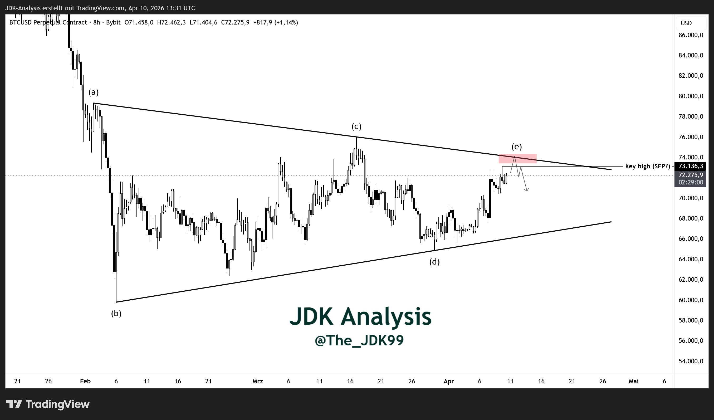 In their latest X analysis, trader JDK Analysis flagged BTC/USD acting within a narrowing wedge — a topic of debate since February.
