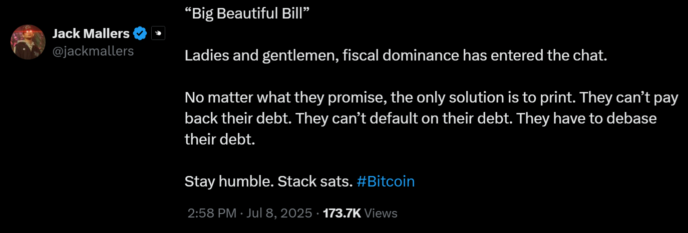Jack Mallers, co-founder and CEO of Strike, noted on X that the only viable option for the US Treasury is to expand the monetary base — an action akin to printing money. Mallers argues that the government is unlikely to default on its debt, meaning debasement becomes the final resort. This, he suggests, creates an ideal environment for a Bitcoin rally.