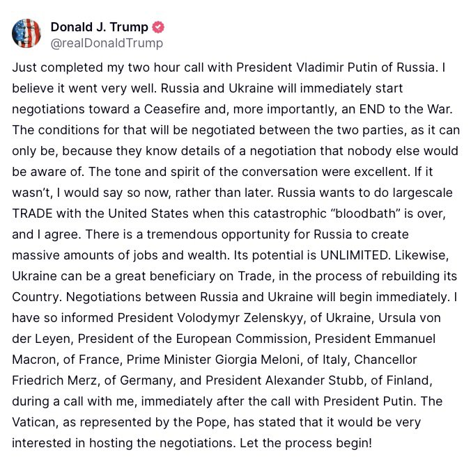 Russia and Ukraine “will immediately start negotiations towards a Ceasefire and, more importantly, an END to the War,” Trump said in a May 19 X post, summarizing his two-hour call with Russian President Vladimir Putin.