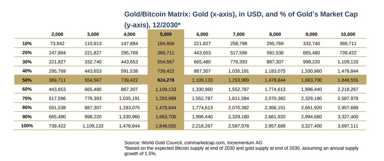 “If gold hits $5,000/oz by 2030 and Bitcoin captures 50% of its market cap, that puts BTC at $924K,” Callahan noted alongside the data from the latest report by In Gold We Trust released this week.