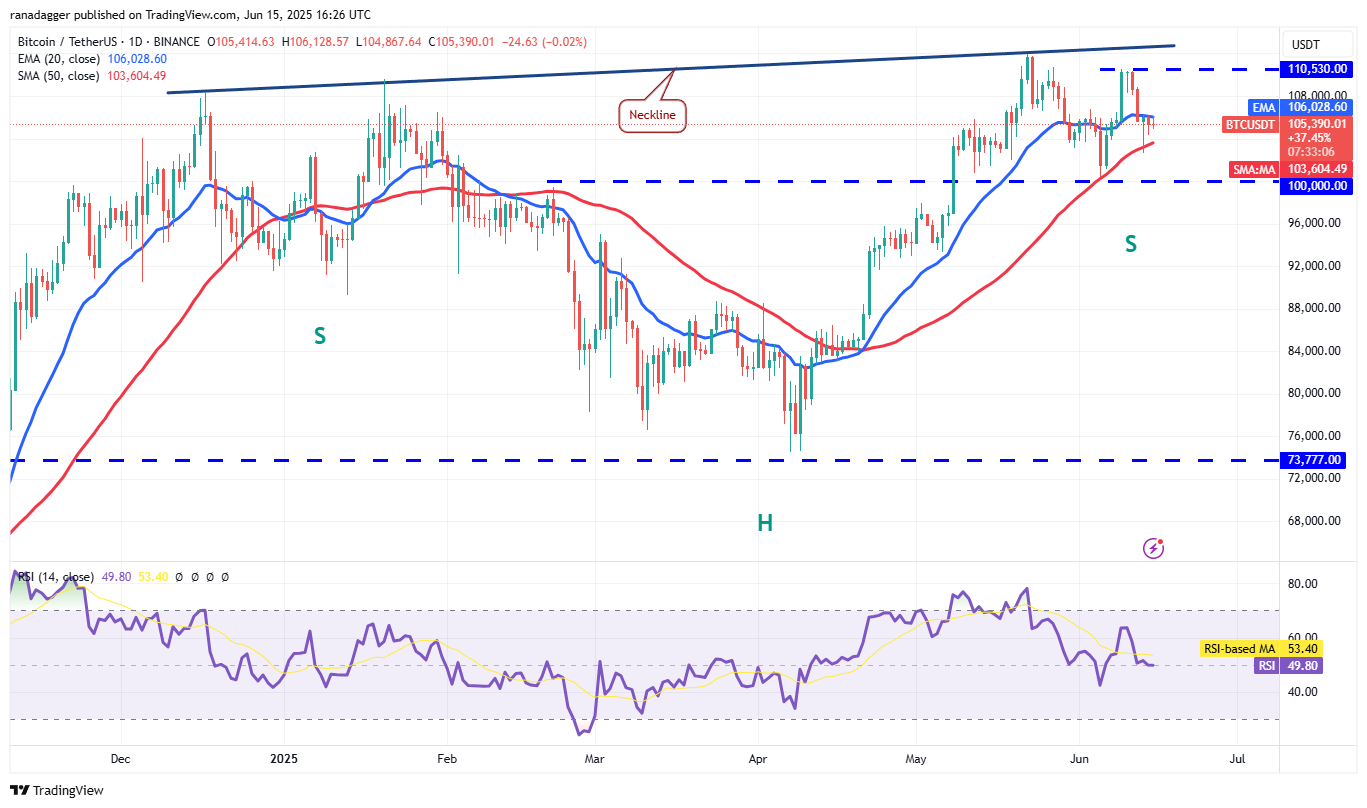 Bitcoin found support at the 50-day simple moving average ($103,604) on Friday, but the bulls are struggling to push the price above the 20-day exponential moving average ($106,028). That suggests a lack of buying at higher levels.