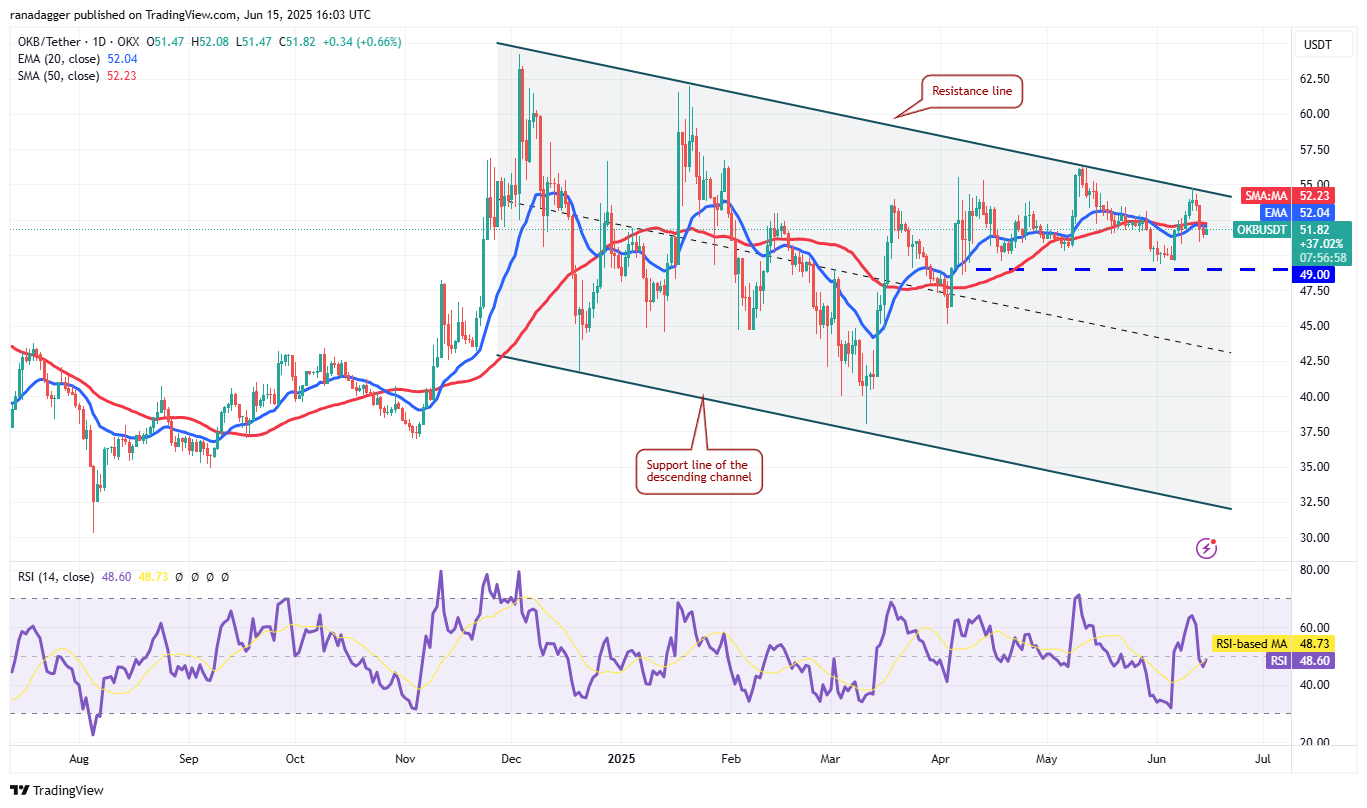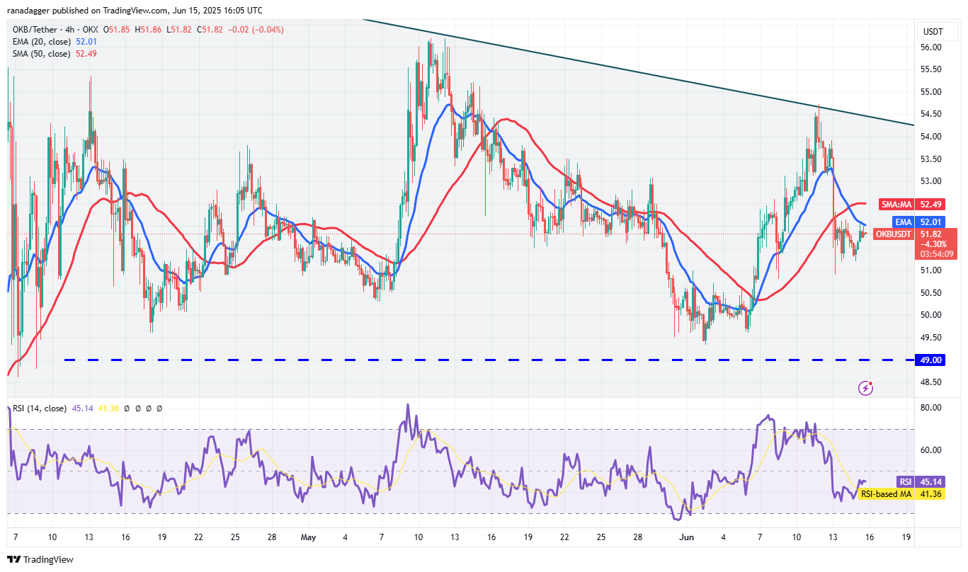 A minor advantage in favor of the bulls is that they have not allowed the price to fall to the $49 support. That signals buying on dips. If buyers push the price above the moving averages, the OKB/USDT pair could move up to the resistance line. Repeated retest of a resistance level tends to weaken it. If buyers pierce the resistance line, the pair could rally to $56 and then to $60.