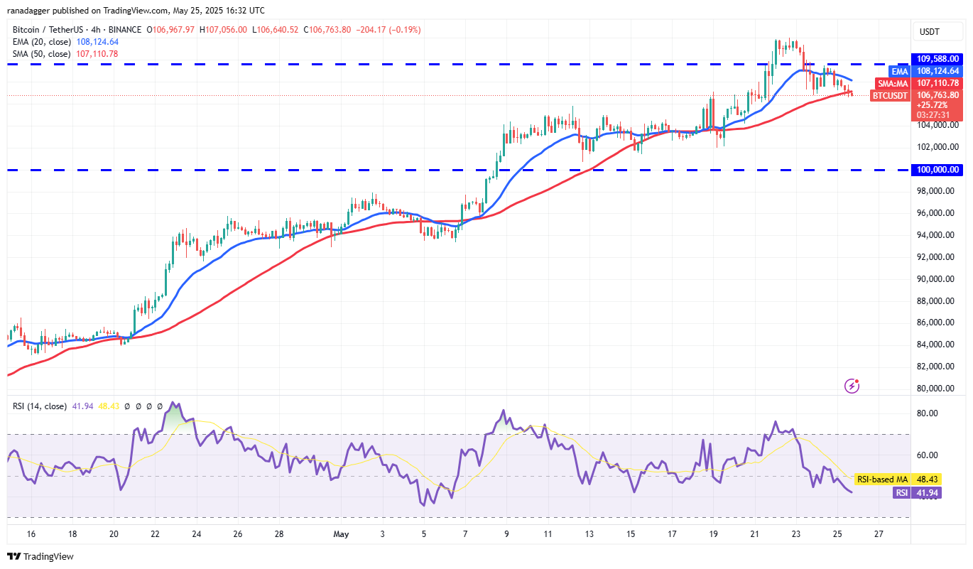 Bitcoin dropped back below the breakout level of $109,588 on May 23, and the bears thwarted attempts by the bulls to push the price back above the overhead resistance on May 24.