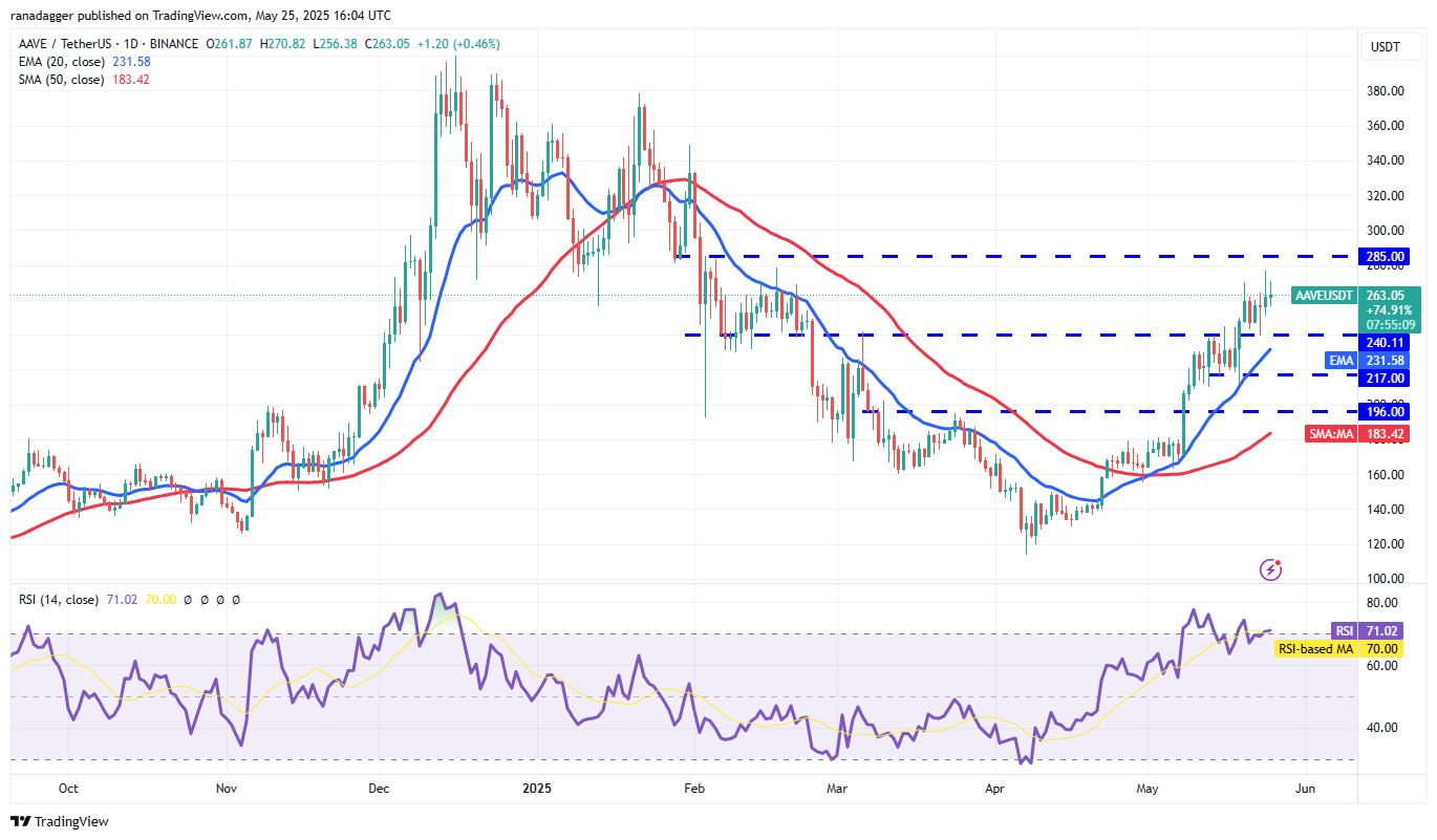 The rising 20-day EMA ($231) and the RSI in the overbought zone show that the bulls have the edge. The AAVE/USDT pair could rally to the $285 level, which is expected to behave as a strong resistance. If buyers overcome the barrier at $285, the up move could extend to $300 and later to $350.