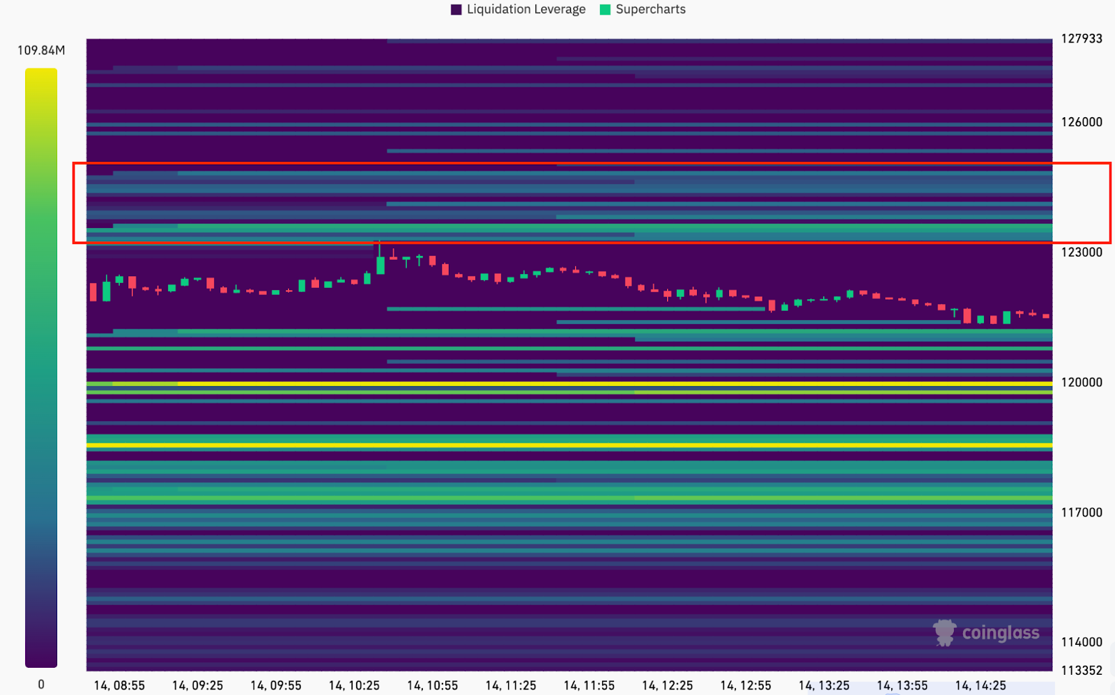 The BTC/USDT 24-hour liquidation heatmap shows the big liquidity clusters building just above $123,000 up to $125,000, per data from CoinGlass.