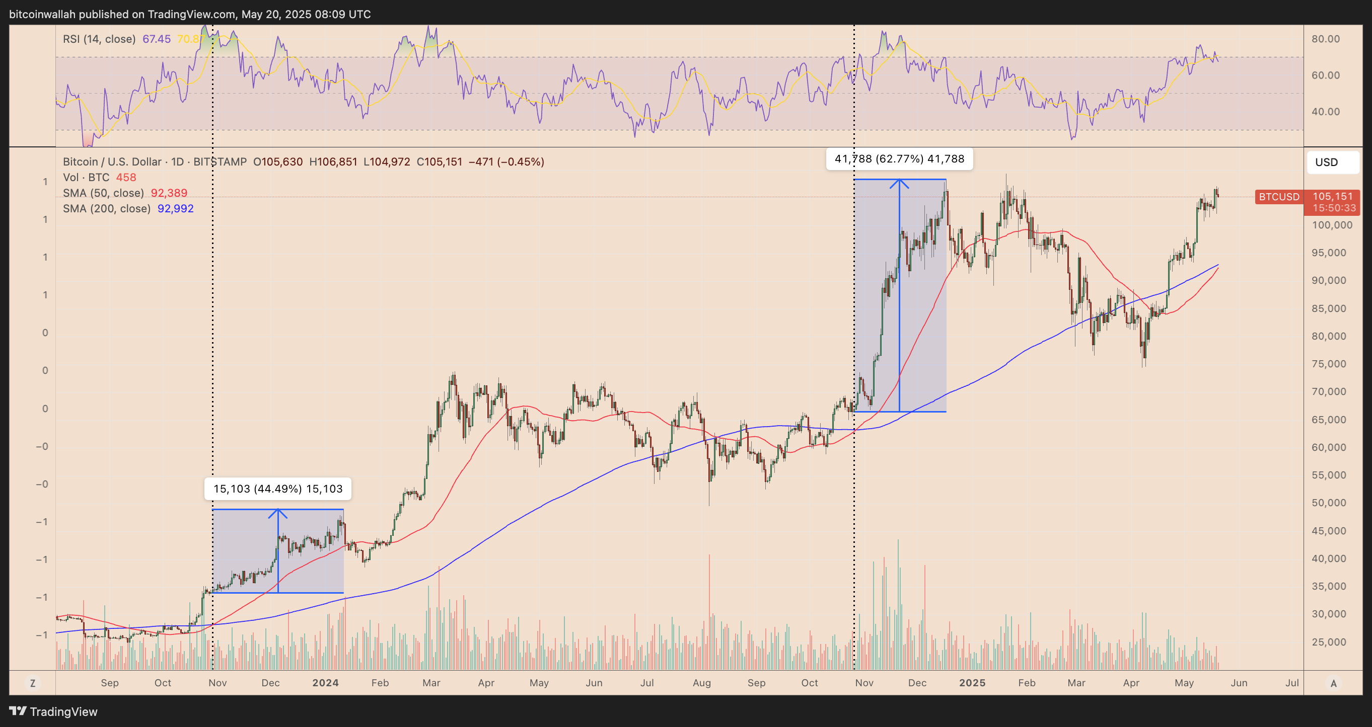 As of May 20, Bitcoin’s 50-day simple moving average (50-day SMA; the red wave) was eyeing a close above its 200-day SMA (the blue wave) for the first time since October 2024, forming a golden cross.