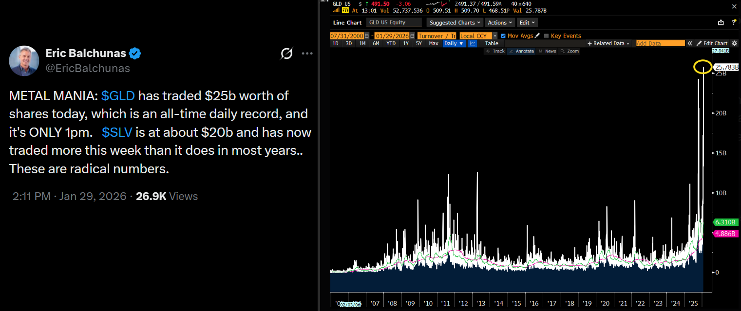 The Bitcoin dip on Thursday coincided with gold prices crashing 8% in under 30 minutes, though the metal recovered half those losses shortly after. Bloomberg senior ETF analyst Eric Balchunas noted that the SPDR Gold Shares ETF (GLD US) saw trading volume exceed $25 billion on Thursday, marking a record high.