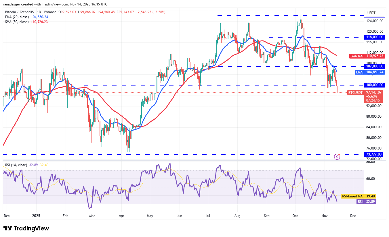 The downsloping 20-day exponential moving average ($104,850) and the relative strength index (RSI) near the oversold territory indicate that the path of least resistance is to the downside. Any recovery attempt is likely to face selling at the breakdown level of $100,000. If the price drops below $100,000, it signals that the bears have flipped the level into resistance. That suggests the resumption of the downtrend.