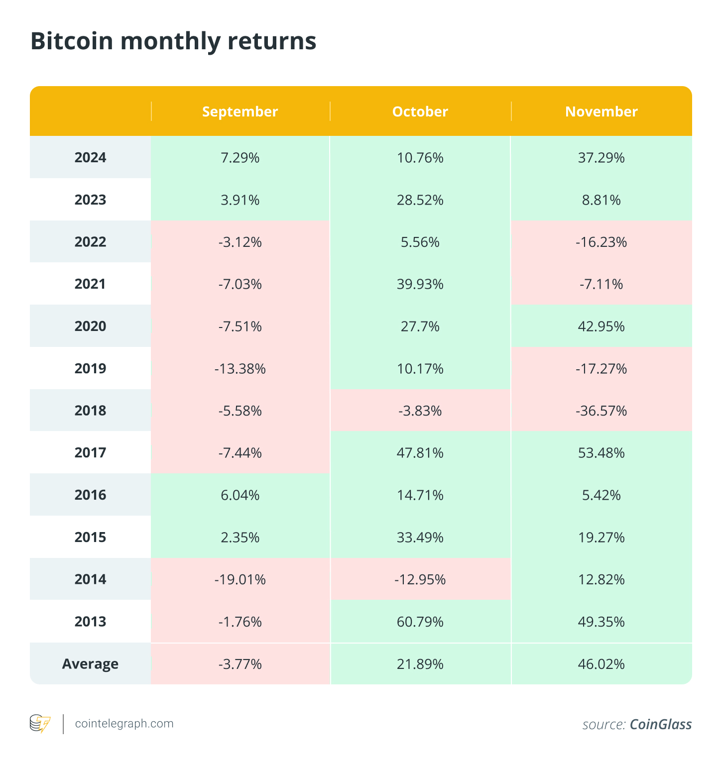 The gloom often doesn’t last. September’s losses have historically given way to October, or “Uptober,” a month that has delivered gains in six consecutive years and only two losses in Bitcoin’s history, according to CoinGlass.