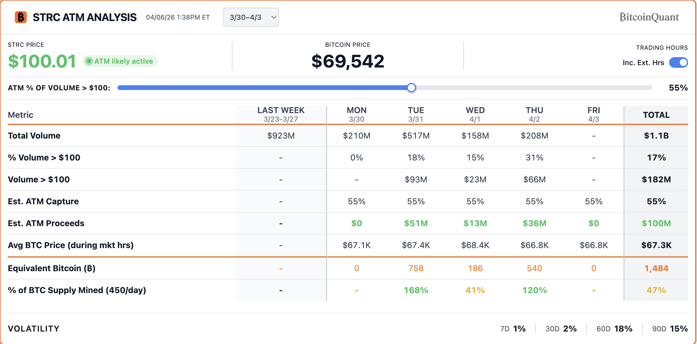 But when STRC slipped below par in mid-March, issuance slowed. Earlier below-par episodes had coincided with 25%–40% BTC pullbacks, including a nearly 40% drop over three weeks after a January pause.