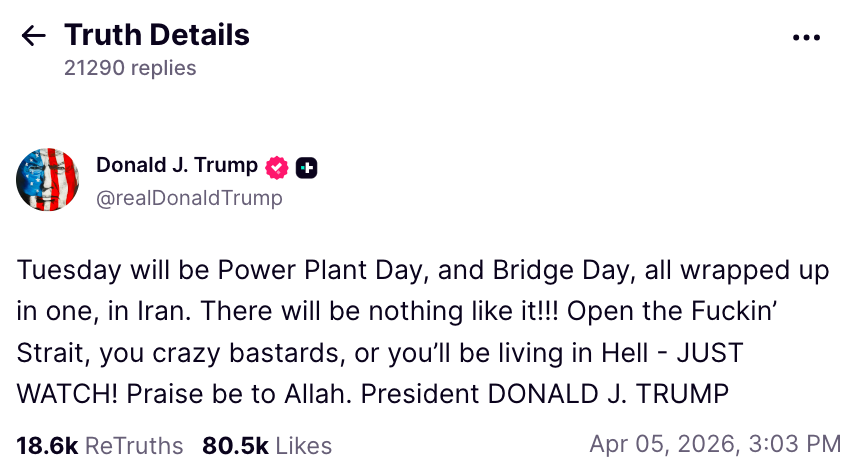 In a post on Truth Social at the weekend, Trump appeared particularly impatient, calling the day of the deadline “Power Plant Day” and “Bridge Day” while demanding that Hormuz reopen.
