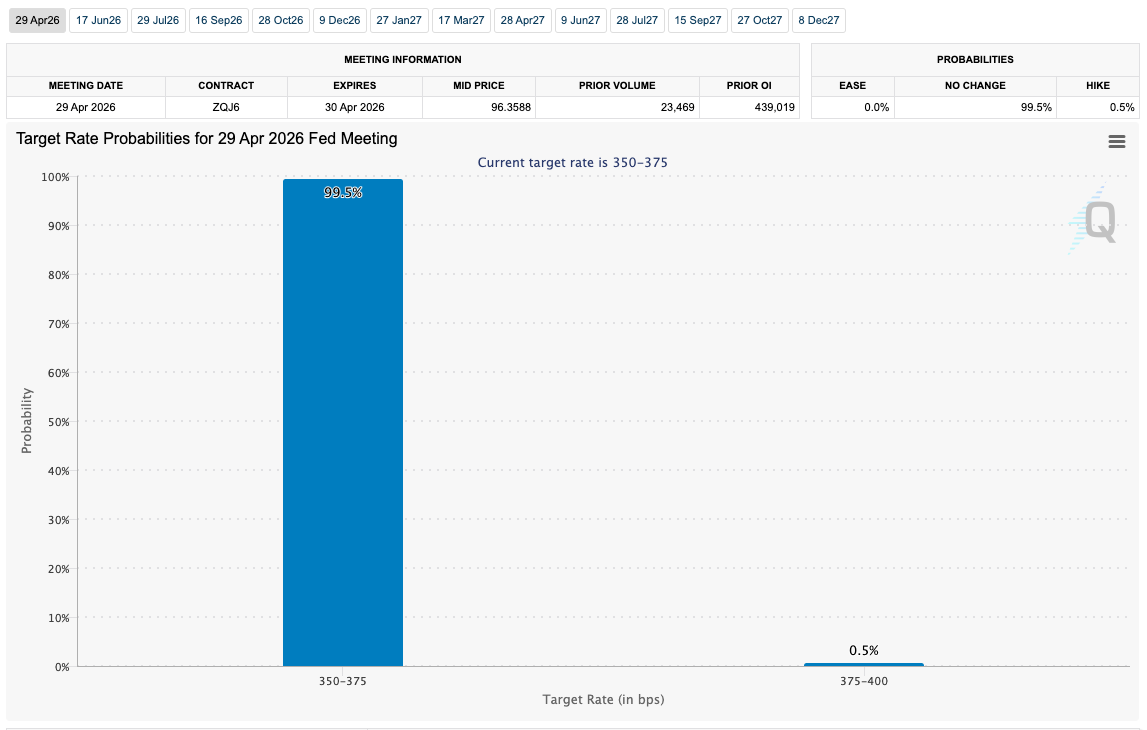 The latest data from CME Group’s FedWatch Tool meanwhile shows practically no chance of the Fed either raising or lowering interest-rates at its next meeting at the end of April.