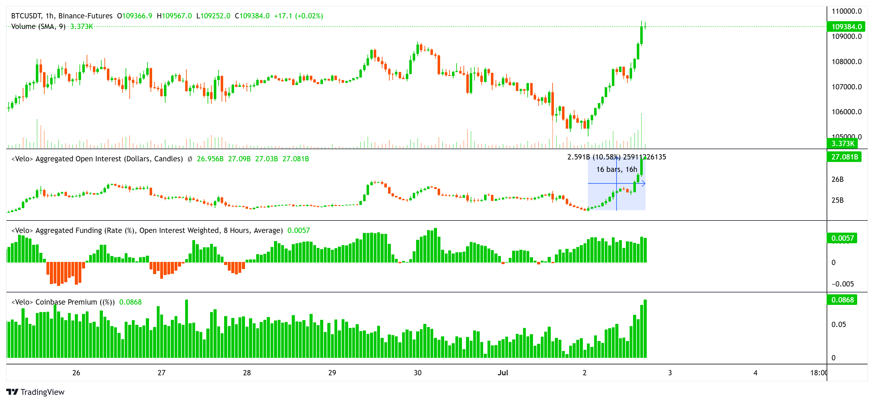 Bitcoin’s recent price jump to $109,500 from $105,200 was outlined by a sharp rise in derivatives activity, pointing to renewed momentum. Open interest (OI) across major futures exchanges surged by 10%, or approximately $3.2 billion, signaling a substantial influx of capital into the market. The increase was primarily driven by long positions, suggesting confidence in further upside.