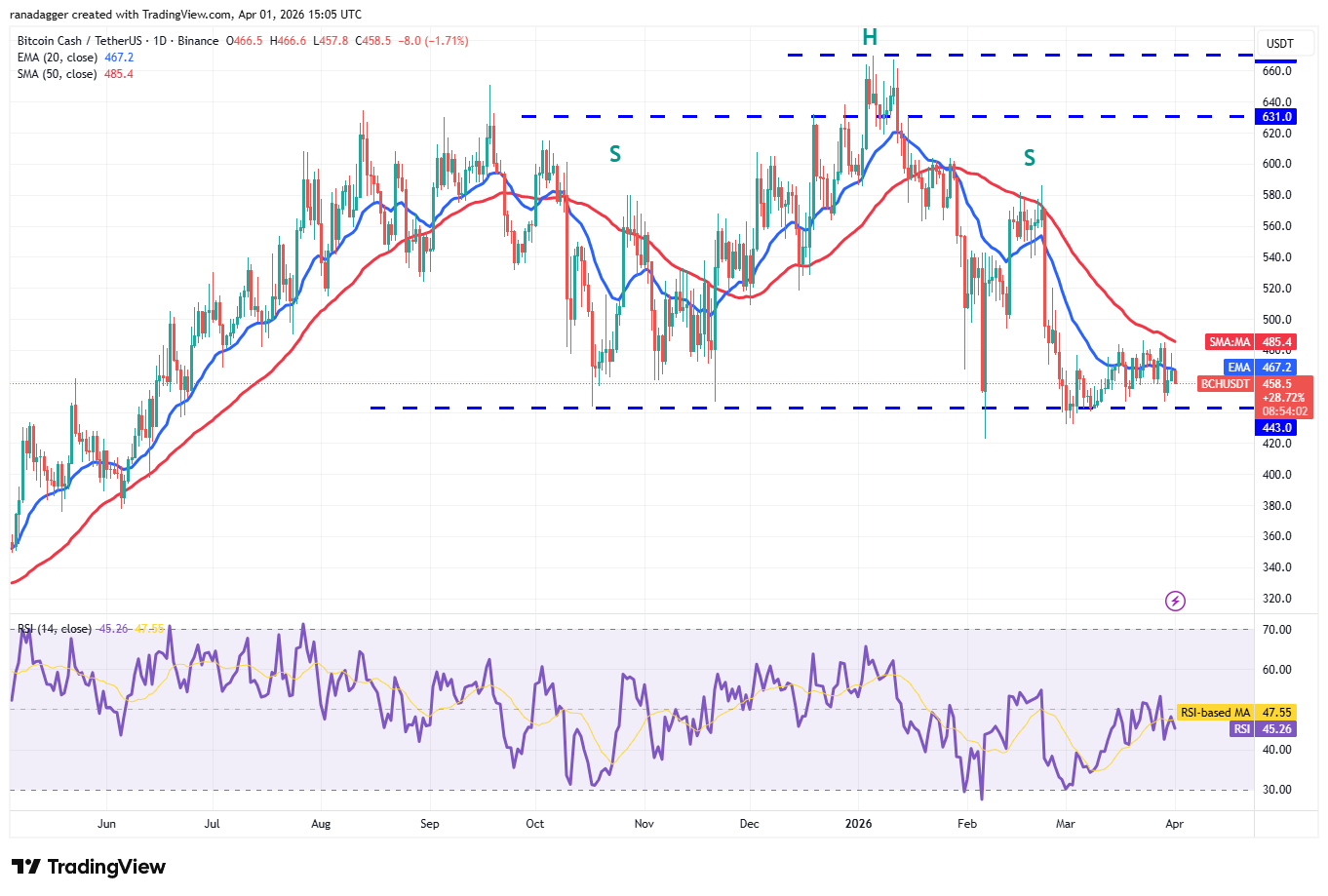 Bitcoin Cash (BCH) has been trading between the 50-day SMA ($485) and the $443 support for the past few days.