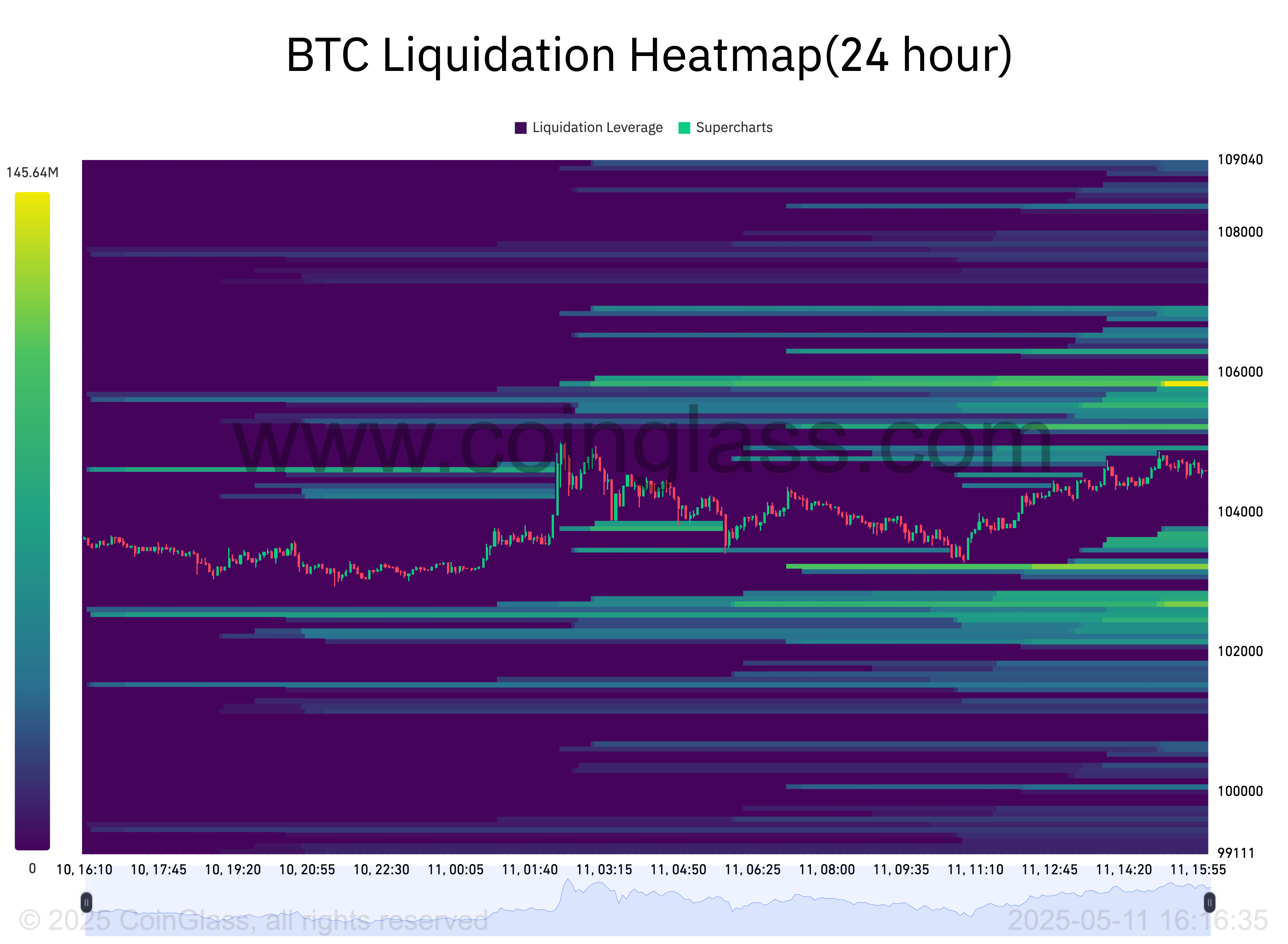 Liquidity is tightly clustered around current spot price, with $106,000 the likely next battleground.