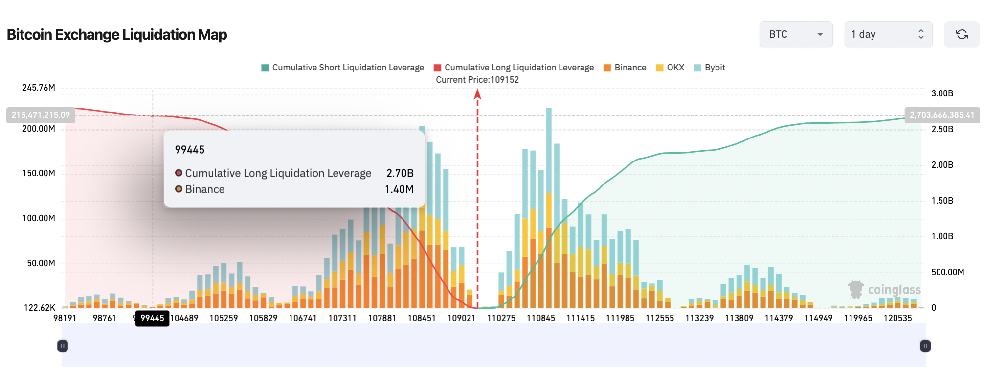 Bitcoin hasn’t dropped below $100,000 since June 22, when it briefly touched $98,900 amid the conflict between Israel and Iran. A move back below this level would wipe approximately $2.67 billion in long positions, according to CoinGlass data.