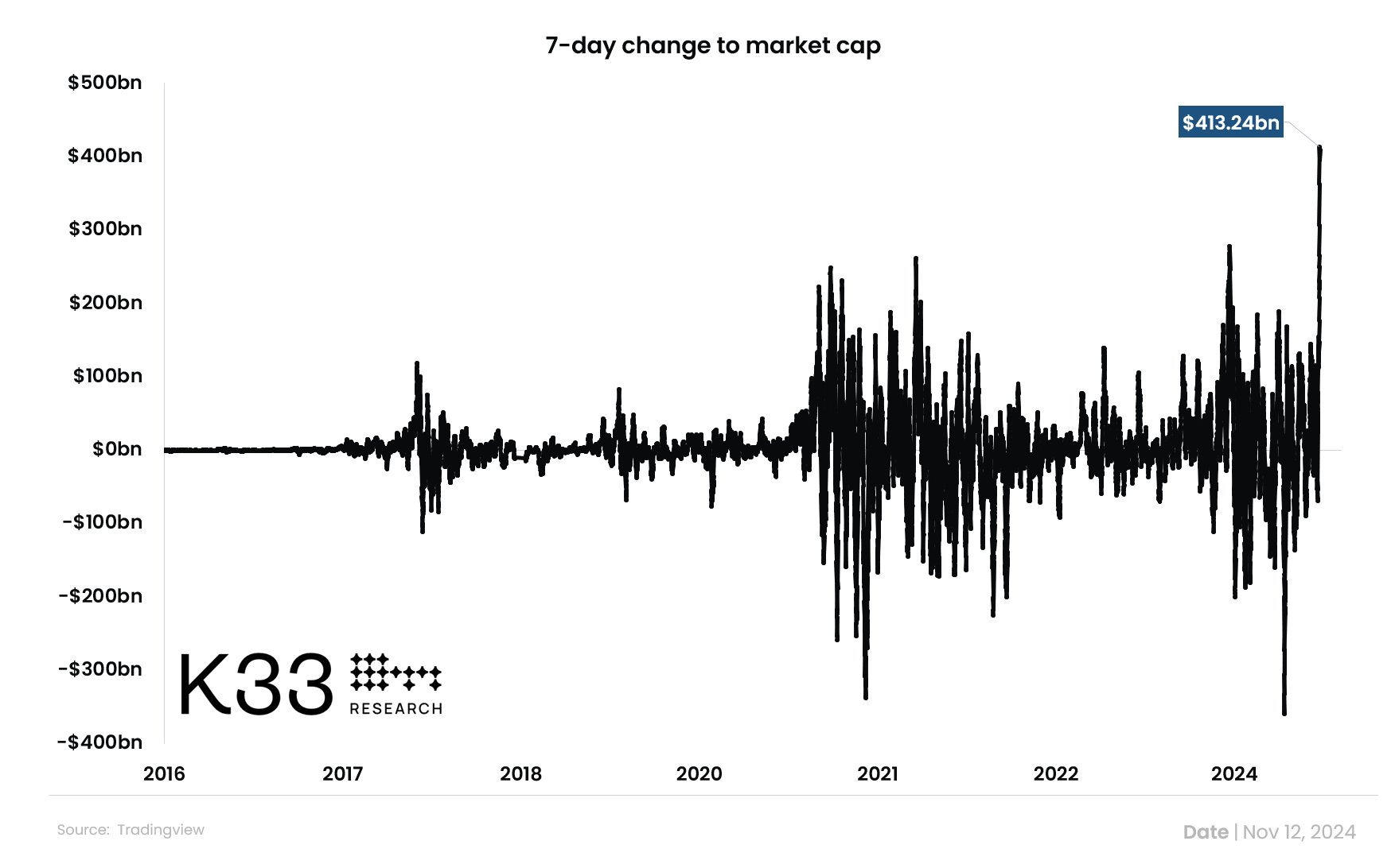 “Bitcoin has seen its best 7-day return since the U.S. banking crisis on March 18, 2023. Bitcoin’s market cap has grown by a staggering $413bn in the past week!”