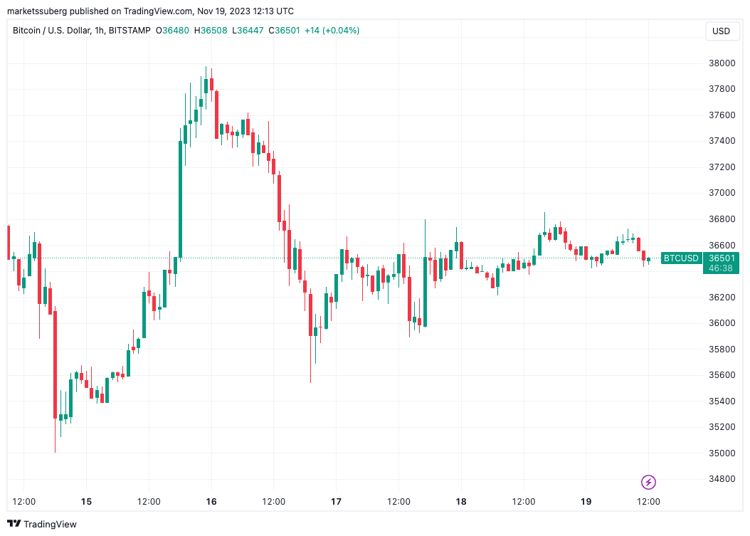 BTC/USD currently trades at $36,500, per data from Cointelegraph Markets Pro and TradingView, having tracked sideways throughout the weekend.