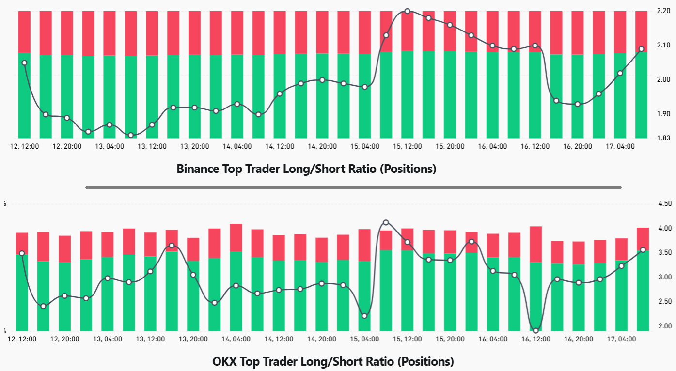 The exchanges’ top traders’ long-to-short ratio provides a broader gauge of market sentiment, as it includes futures, margin, and spot markets.