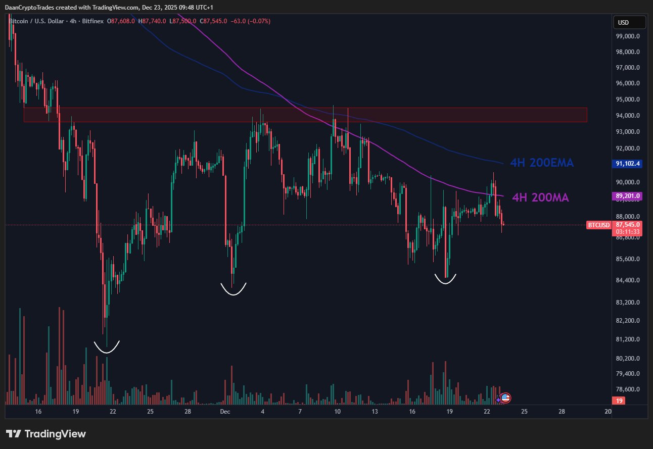 “$BTC Keeps rejecting from its 4H 200MA/EMA Trend,” trader Daan Crypto Trades observed in his latest analysis on X.