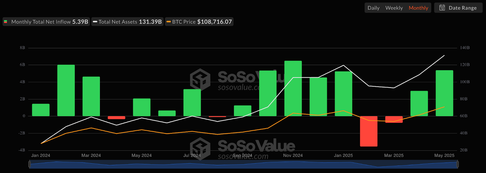In terms of taking out the resistance seen at $110,000, flows could possibly remain suppressed as US markets are closed for the Memorial Day holiday, so the daily open market demand seen by the spot Bitcoin ETFs, which accounted for $8.36 billion in BTC purchasing since the start of April, are paused for the day.