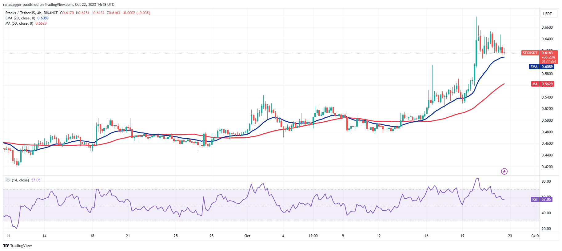 The bullish crossover on the moving averages suggests that the bulls have an edge. In the short term, the overbought levels on the RSI indicate that a minor correction or consolidation is possible. The first support on the downside is the 20-day EMA ($0.54).