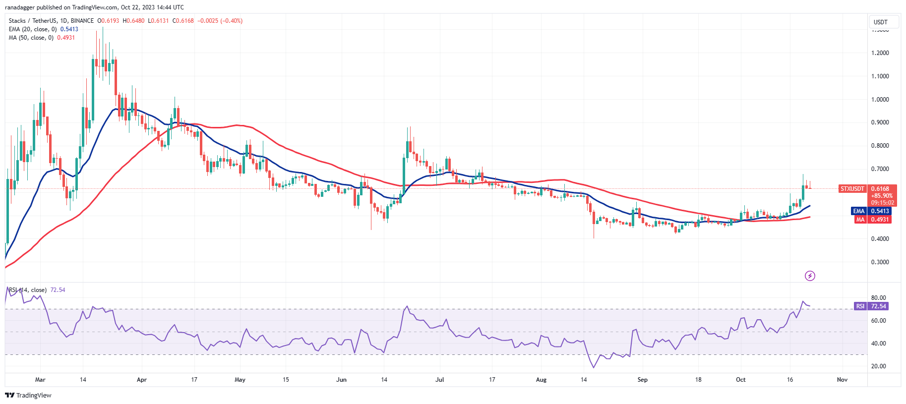 If the price rebounds off this level, it will signal a change in sentiment from selling on rallies to buying on dips. That will increase the likelihood of the continuation of the up-move. The STX/USDT pair could first rise to $0.80 and subsequently to $0.90.