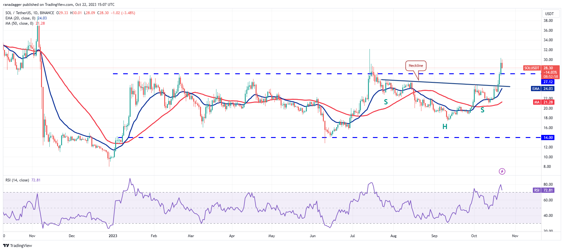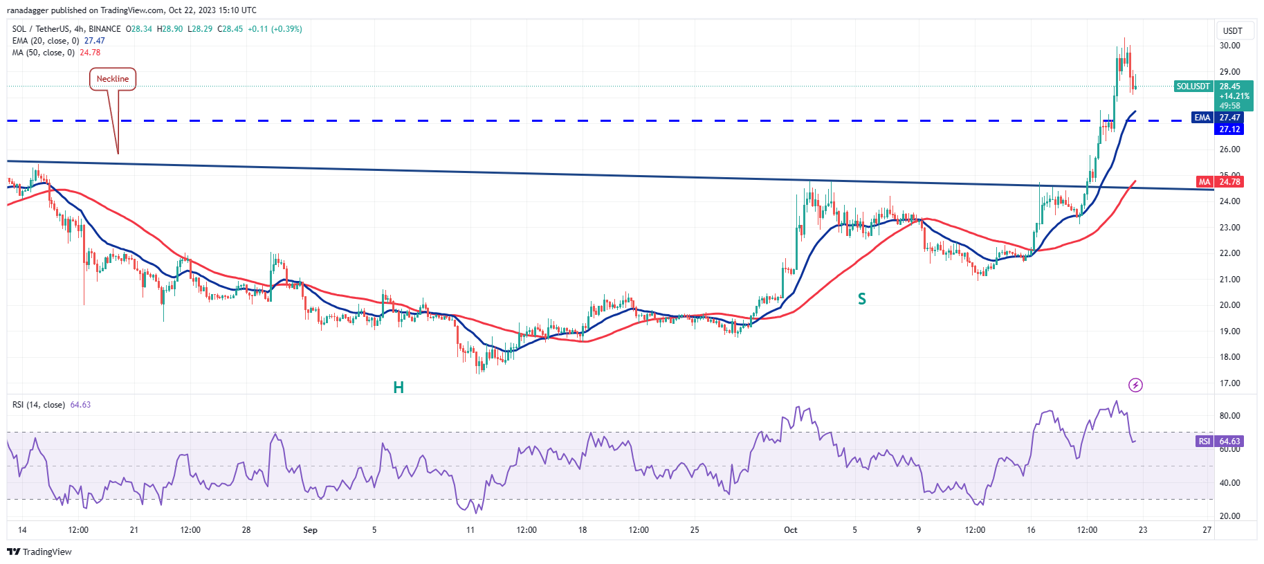 Solana (SOL) broke out of the neckline on Oct. 19, completing a bullish inverse head and shoulders pattern. This setup has a target objective of $32.81.