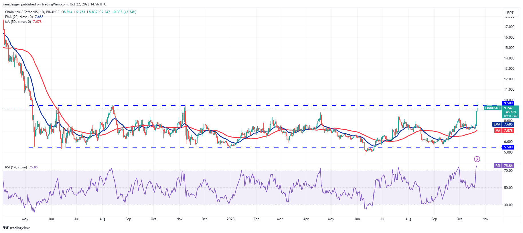Chainlink (LINK) has been trading inside a tight range between $5.50 and $9.50 since May 2022 indicating a balance between supply and demand.