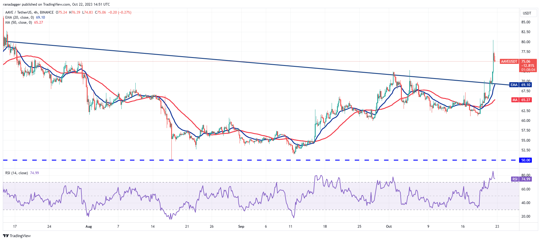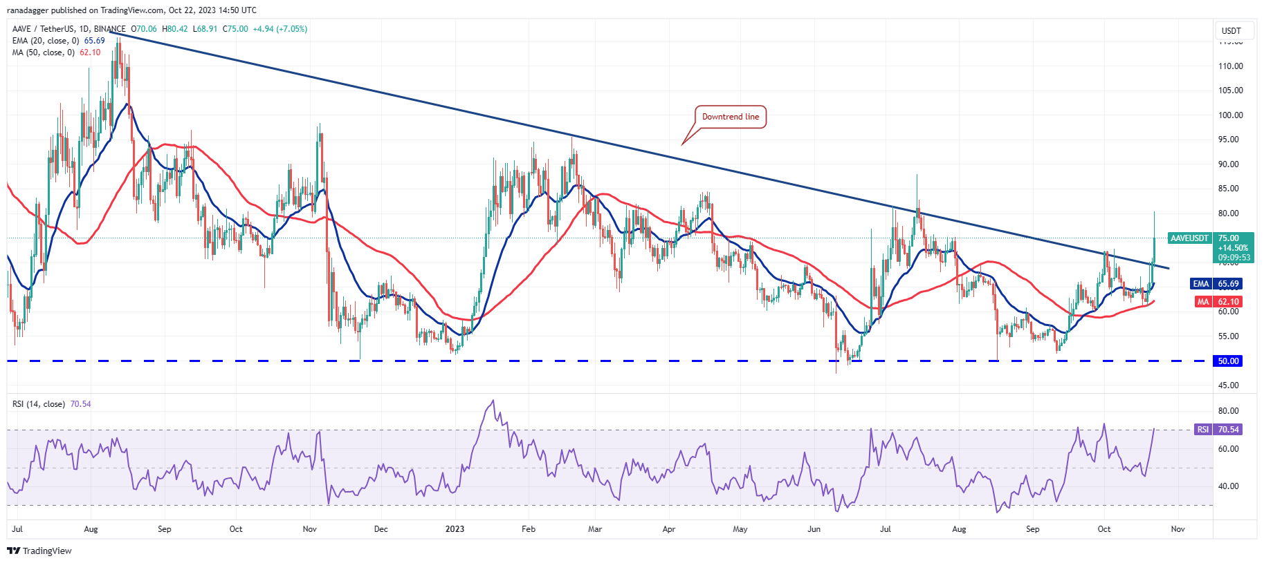 Both moving averages have started to turn up and the RSI is in the overbought territory, indicating that bulls are at an advantage. If the price maintains above the downtrend line, the AAVE/USDT pair may first surge to $88 and then to $95.