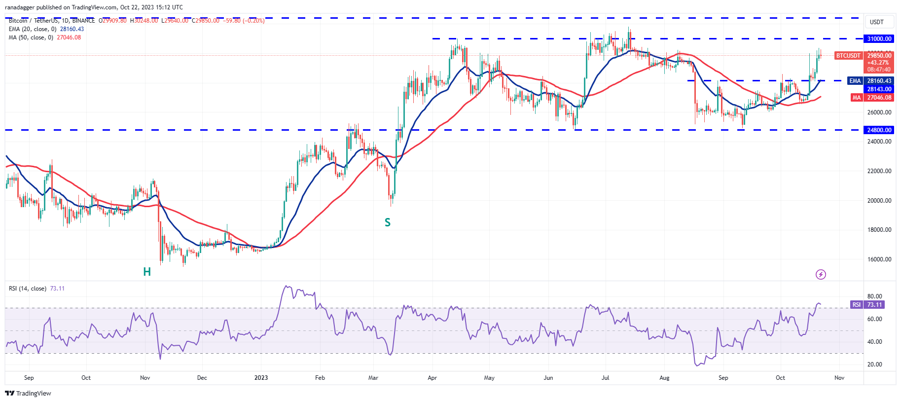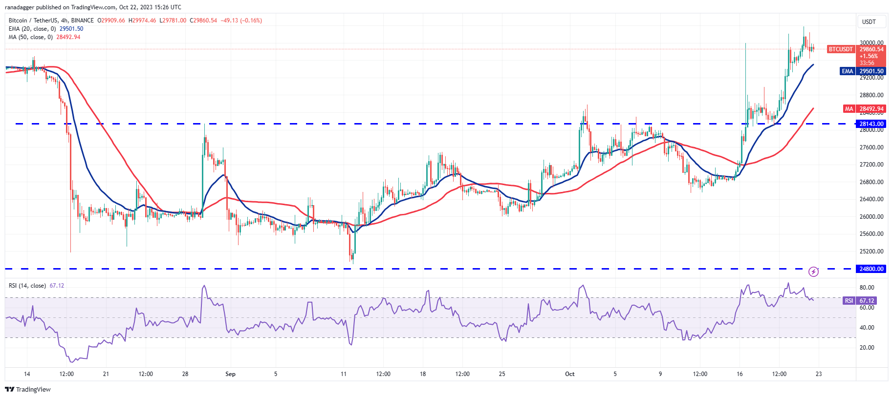 The pair is in an uptrend as seen on the 4-hour chart. Normally, during an ascent, traders buy the dip to the 20-EMA. If that happens, it will signal that the sentiment remains bullish and every minor dip is being purchased. The pair may then continue its journey toward $32,400.