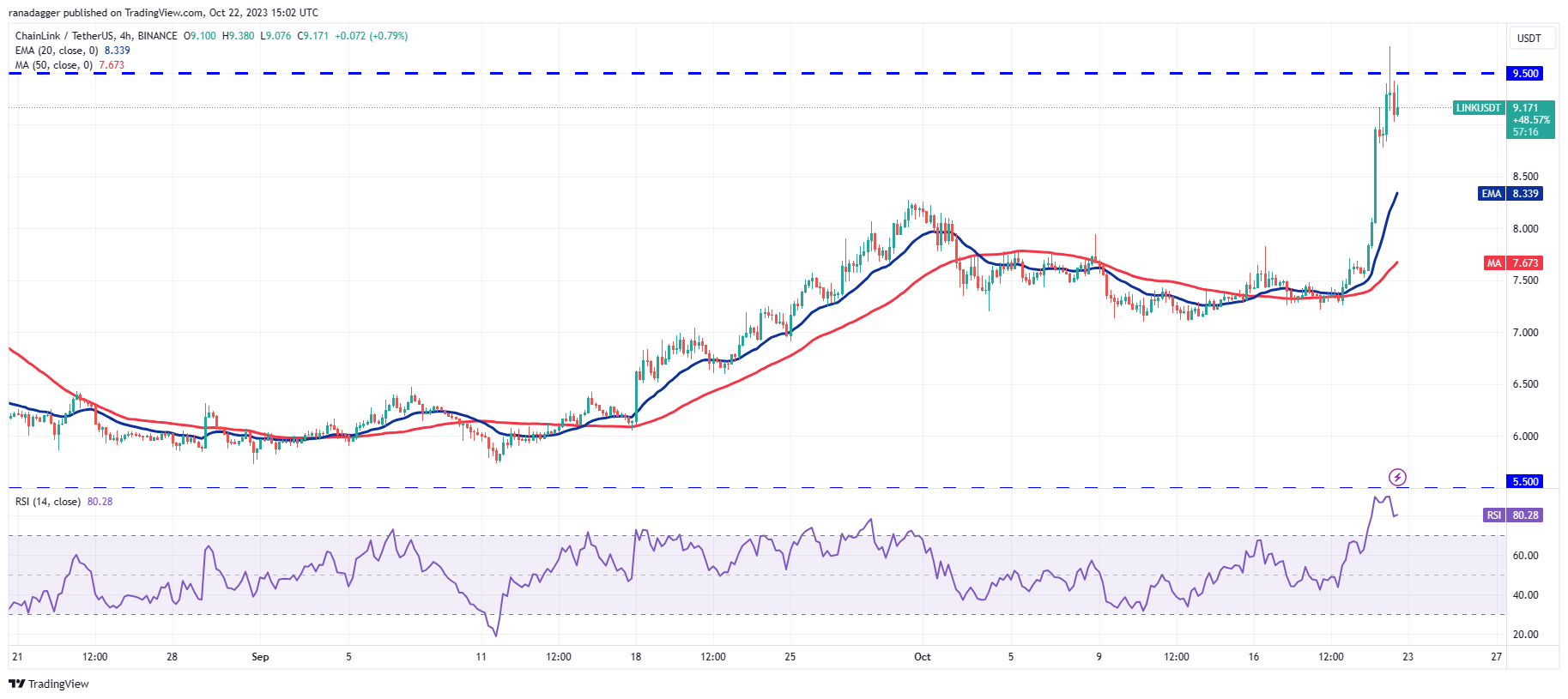 The pair witnessed a sharp rally from $7.50, which propelled the RSI deep into the overbought territory on the 4-hour chart. This suggests that the rally is overextended in the near term and could result in a pullback or consolidation.
