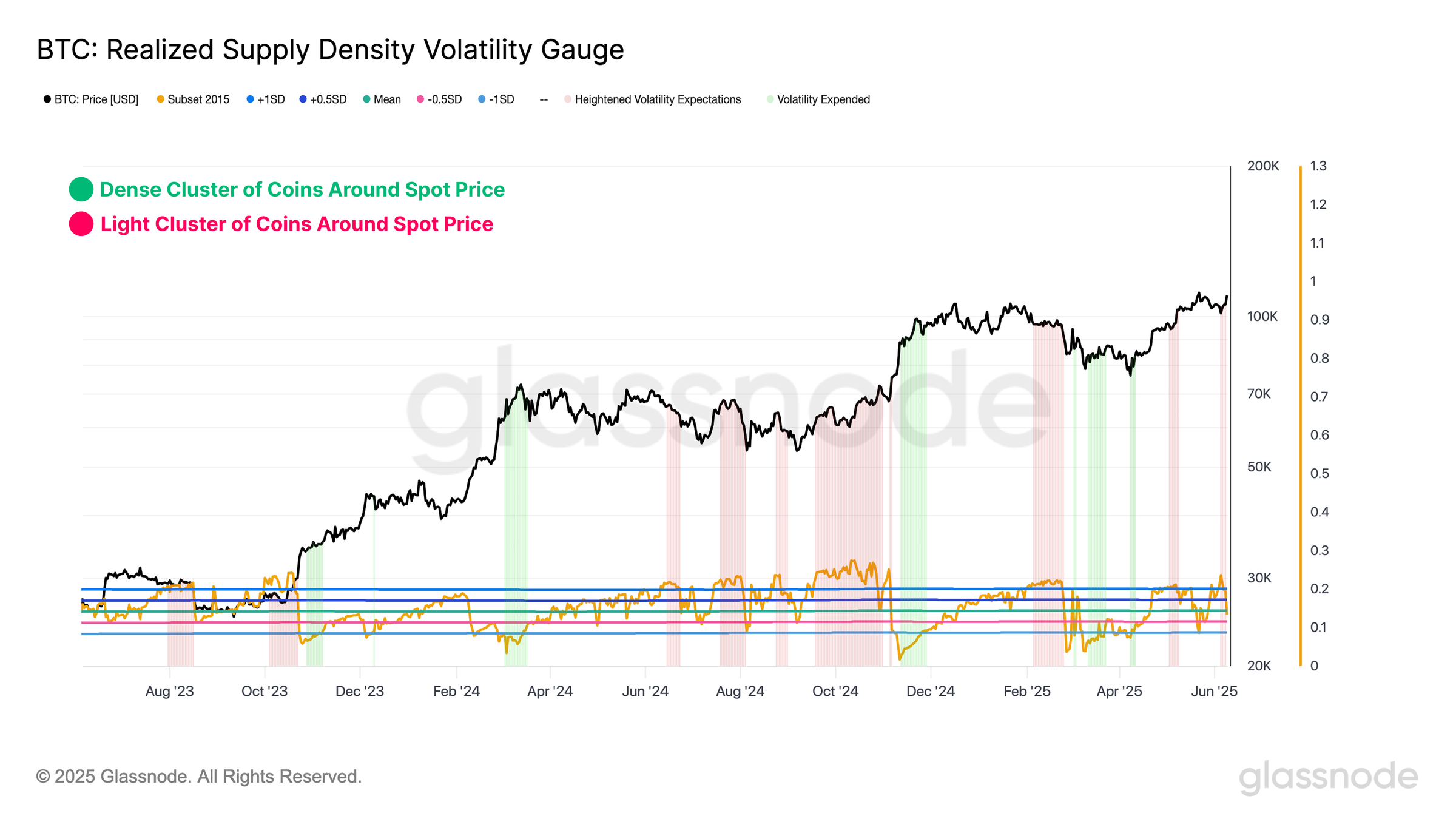 Bitcoin’s current volatility profile presents a paradox. On one hand, realized supply density, which measures how concentrated Bitcoin’s ownership is near the current price, has climbed in recent weeks. This signals that several investors bought around the $105,000-$110,000 level. In such tightly clustered environments, minor price swings can trigger outsized emotional or trading responses, raising the risk of sudden volatility.