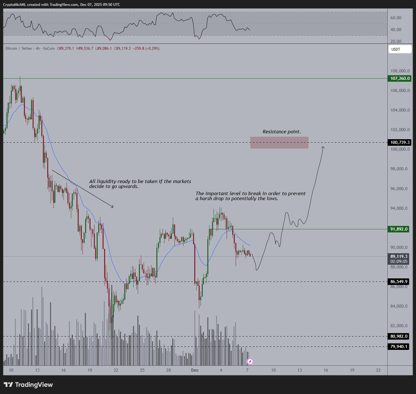 BTC/USDT four-hour chart with volume, RSI data. Source: Michaël van de Poppe/X