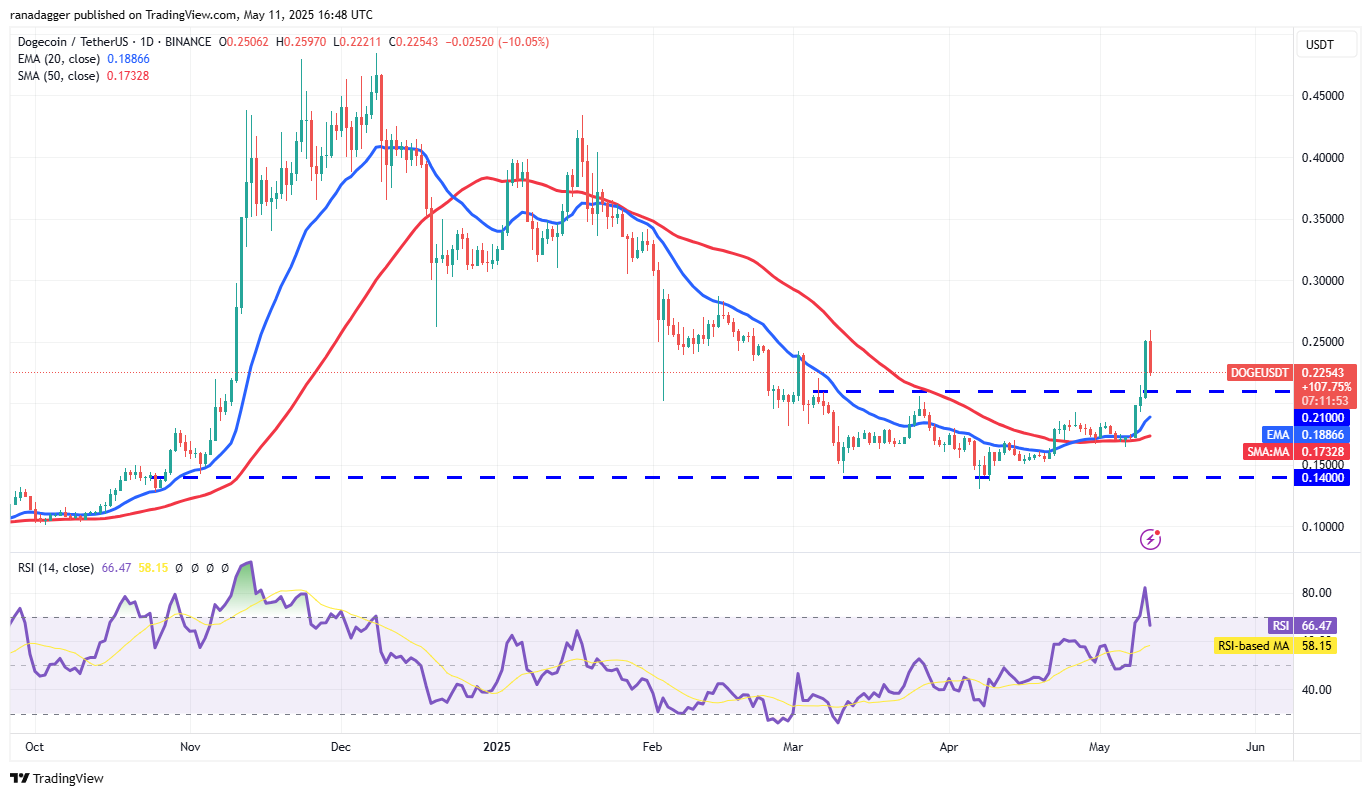 If buyers want to prevent the upside, they will have to pull the price below the 20-day EMA ($0.19). If they do that, the DOGE/USDT pair could swing inside a large range between $0.26 and $0.14 for a while.