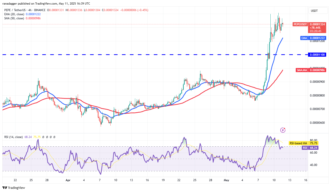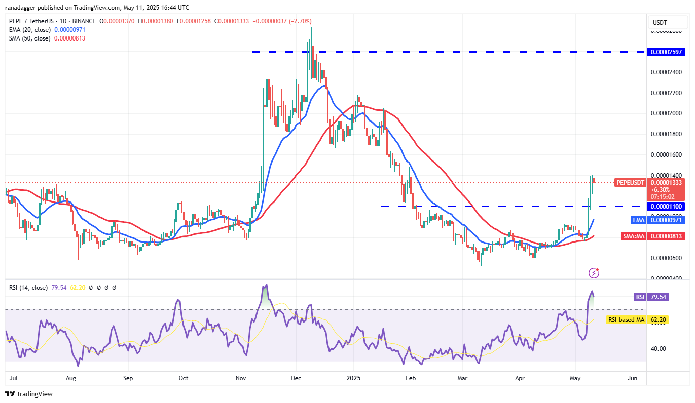 Pepe (PEPE) rallied sharply from the 50-day SMA ($0.000008) and broke above the $0.000011 overhead resistance on May 8.