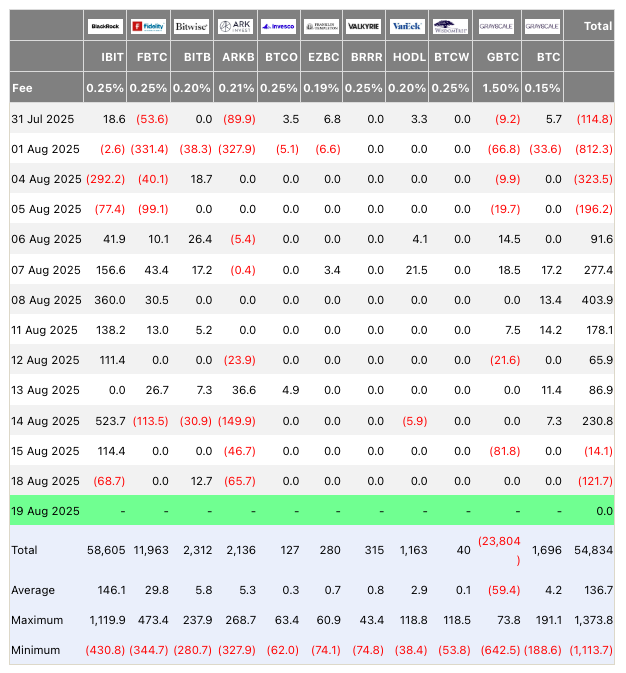 The ETFs recorded a net outflow of $121 million on Monday, per data from UK investment firm Farside Investors. The largest ETF offering, BlackRock’s iShares Bitcoin Trust (IBIT), saw its first outflows since Aug. 5.