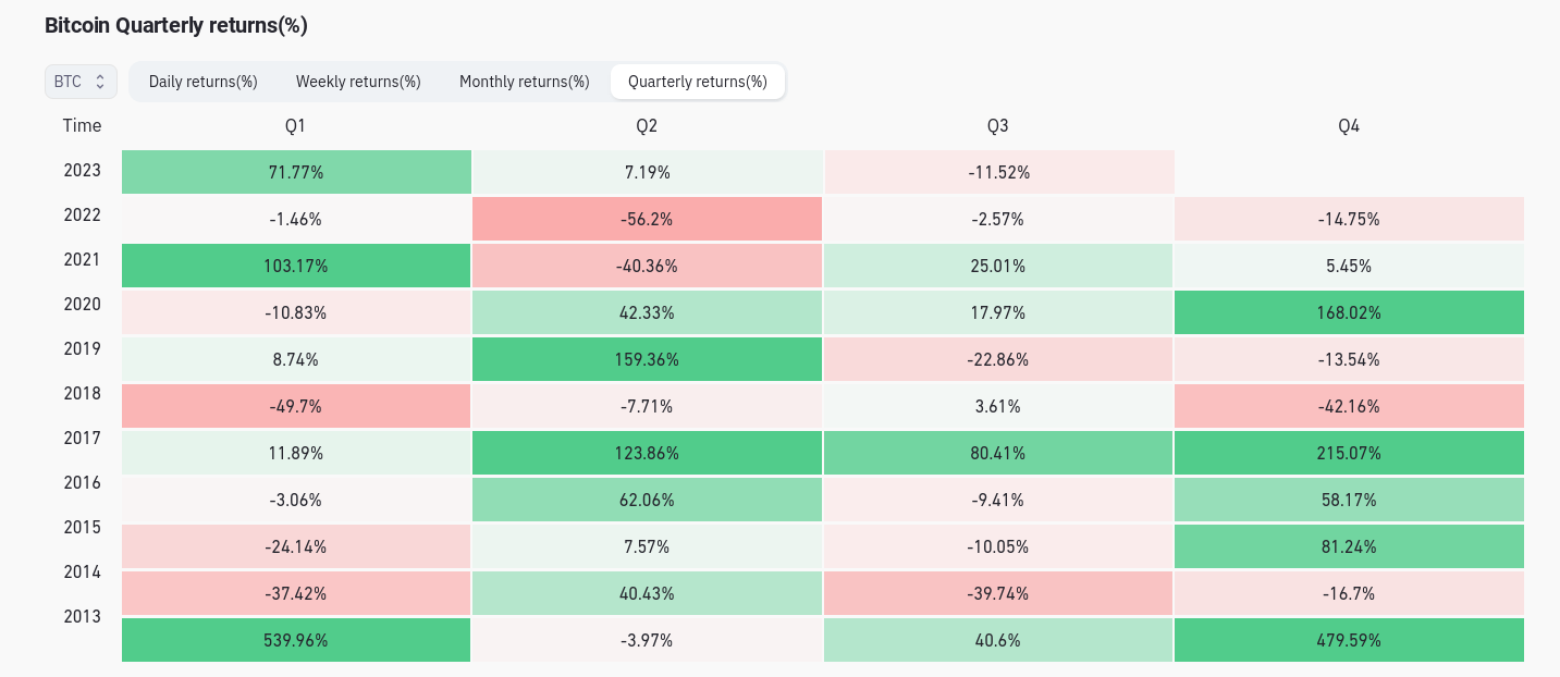 Conversely, the quarterly performance for Q3 showed BTC/USD down 11.5% at the time of writing.