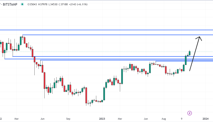 Chart analysis suggests that with Bitcoin having broken convincingly to the north of the resistance $32,000-$34,000ish resistance zone, a rally towards 2022 highs around $48,000 is likely.